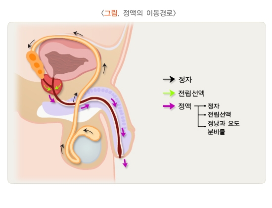 정액의 약 60%는 정낭에서, 약 30%는 전립선에서, 나머지 5% 정도는 요도에서 생산되는 분비물로 구성되며, 고환에서 생산되는 정자는 정관을 타고 정낭으로 이동하여 저장되었다가 남성이 사정할 때 전립선액과 함께 섞여서 요도를 따라 배출됩니다.