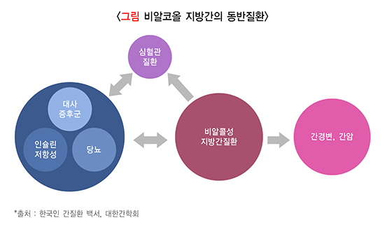 또한 비알코올 지방간질환은 대사증후군, 당뇨와 유의한 연관성이 있으며, 지방간 환자에서는 심혈관 질환이 유의하게 증가합니다. 한 연구에서는 비알코올 지방간 환자에서 두 번째로 흔한 사인이 심혈관 질환으로 나타났습니다. 따라서 비알코올 지방간 환자는 간기능 악화뿐만 아니라 당뇨병 및 심혈관 질환 역시 지속적으로 스크리닝해야 합니다.