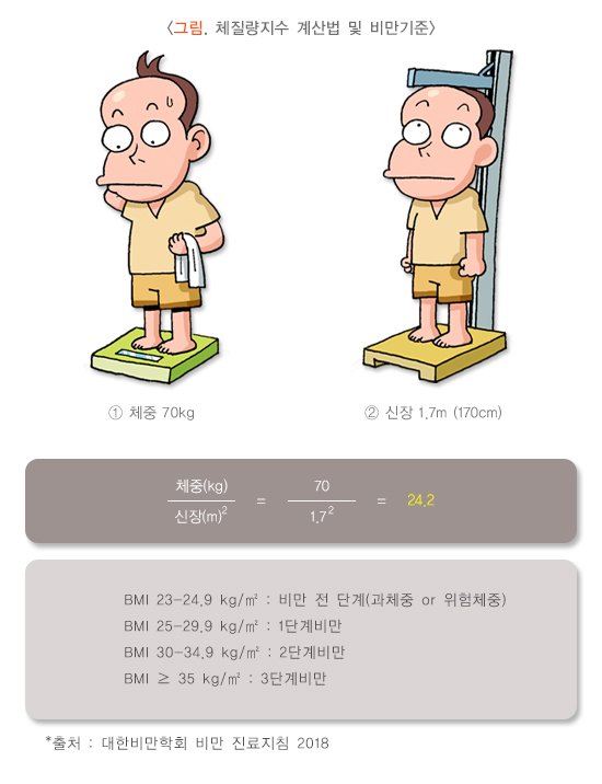 비알코올 지방간을 예방하려면 비만을 예방하는 것이 중요합니다. 비만 여부를 자가 측정할 수 가장 손쉬운 방법은 체질량지수(BMI)를 계산하는 것입니다. BMI는 체중(kg)을 키(m)의 제곱으로 나눈 수치입니다. 한 가지 유의할 점은 BMI는 근육, 지방의 구분이 아니라 단순히 체중만을 기준으로 하며, 비만은 체중이 무거운 상태가 아닌 지방이 많은 상태이므로 비만도를 평가할 때 체지방률을 같이 평가하는 것이 좋습니다.