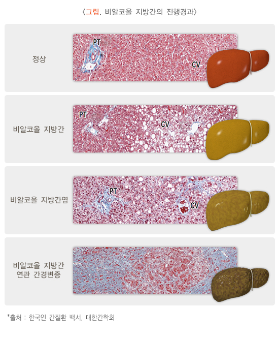 대부분의 지방간은 위험하지 않지만 축적된 지방에서 간에 해로운 물질(사이토카인)이 분비되어 10명 중 2~4명은 간염, 간경변증, 간암 등 심각한 병으로 진행할 수 있습니다. 비알코올 지방간질환은 진행 상태에 따라 단순 지방간, 지방간염, 지방간 연관 간경변증으로 분류합니다.