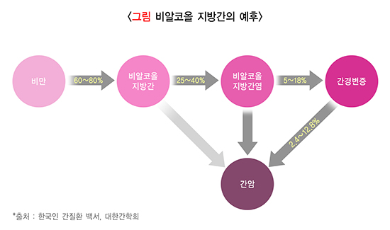 지방간은 대부분 경과가 양호하지만, 일부 비알코올 지방간염 환자는 간경변증이나 간암 등 보다 심각한 간질환으로 진행할 수 있습니다. 일반적으로 비만인 사람의 60~80%가 비알코올 지방간 질환을 동반하며, 지방간 환자의 25~40%는 지방간염으로 진행합니다. 지방간염 환자의 5~18% 정도는 간경변증으로 진행하고, 비알코올 지방간 연관 간경변증 환자에서 간암 누적발생률은 연간 2.6% 정도로 추정됩니다. 초기 지방간염 상태에서 간경변증으로 진행될 때까지 약 20~30년 정도가 소요되는데, 섬유화가 전혀 없는 경우를 0단계, 간의 상당 부분이 굳은 간경변증을 4단계라고 할 때 1단계 악화되는 데 평균 7년 정도가 소요되는 셈입니다. 비알코올 지방간은 간암 발생과도 연관됩니다. 주로 진행된 섬유화나 간경변증이 있는 환자에서 간암이 발생하나, 섬유화가 없는 환자에서 간암이 발생하는 경우도 있으므로 비알코올 지방간염 환자들은 모두 정기적인 진료를 받는 것이 중요합니다. 정확한 발암 기전은 알려져 있지 않지만 고령, 제2형 당뇨병, 비만 등이 발암을 촉진하는 위험인자로 생각됩니다.