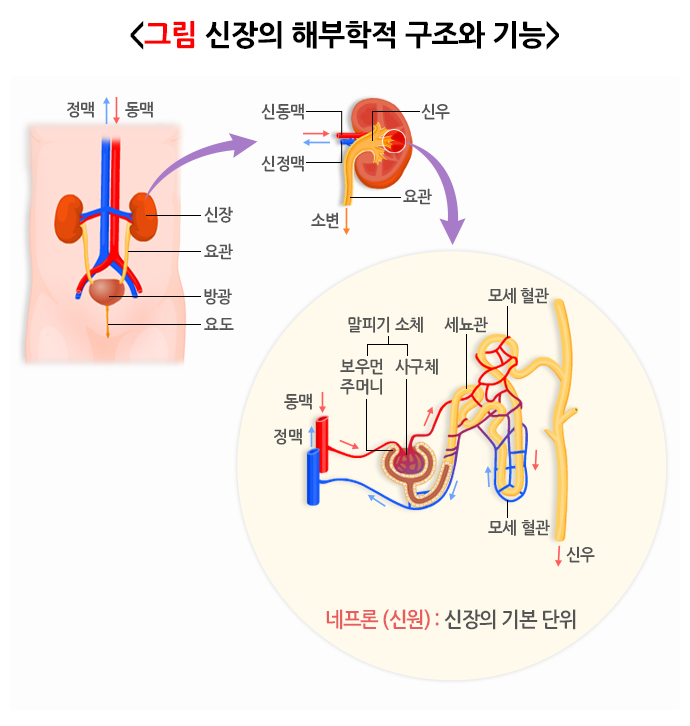 신장은 혈액에서 노폐물과 과도한 체액을 몸 밖으로 내보내 우리 몸을 일정한 상태로 유지합니다. 신장은 좌우에 한 개씩 모두 두 개가 있으며, 각 신장에는 네프론(nephron)이라는 필터 조직이 약 1백만 개씩 존재합니다. 네프론은 신장의 구조적•기능적 단위로 사구체와 보우만 주머니, 신세뇨관으로 이루어집니다. 사구체에서 혈액이 걸러지면 보우만 주머니를 통해 신세뇨관으로 들어가며, 긴 신세뇨관을 통과하면서 소변이 만들어집니다. 즉, 사구체는 미세한 혈관 구조로 혈액을 걸러내는 필터 역할을 합니다.