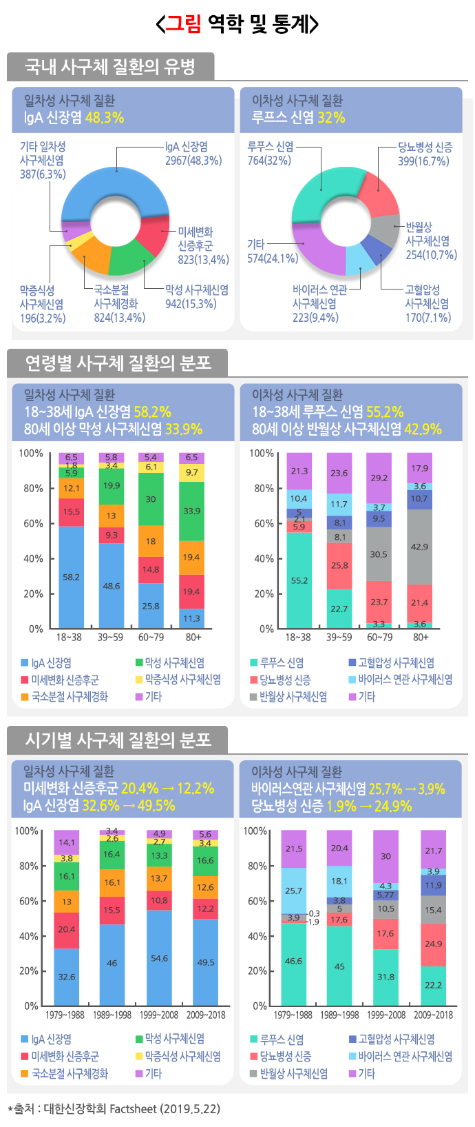 2019년 대한신장학회 자료에 의하면 우리나라에서 가장 흔한 일차성 사구체 질환은 IgA 신장염으로 전체 일차성 사구체 질환의 약 48%를 차지합니다. IgA 신장염은 주로 젊은 나이에 많고, 최근에 증가하는 추세입니다. IgA 신장염 다음으로 막성 사구체 신염, 국소 분절 사구체 경화, 미세변화 신증후군이 비슷한 분포를 보입니다. 막성 사구체 신염은 고령에 많고, 국소 분절 사구체 경화는 나이에 무관하게 고른 분포를 보이며, 미세변화 신증후군은 젊은 연령과 고령에 많고 중년의 나이에 적은 양상을 보입니다.