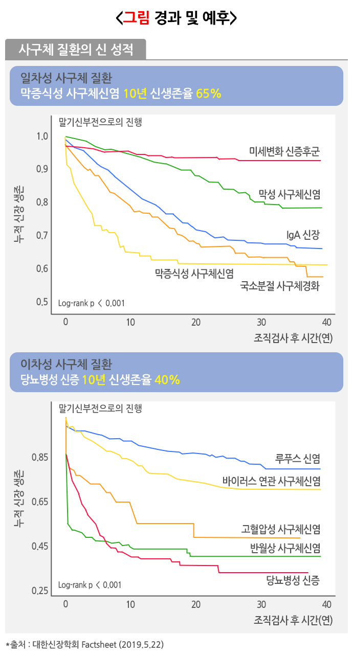 사구체 질환의 예후는 원인 질환에 따라 다양합니다. 2019년 대한신장학회의 보고에 의하면, 일차성 사구체 질환 가운데 막증식성 사구체 질환은 전체 사구체 질환 중 5% 정도로 드물지만, 말기 신부전으로의 진행율은 높기 때문에 예후가 불량한 질환입니다. IgA 신장염과 국소 분절 사구체 경화는 비슷한 신장 예후를 보이고 있어 20년 내에 30% 정도의 환자가 말기 신부전으로 진행합니다. 막성 사구체 신염은 10년 내에 약 20% 정도의 환자가 말기 신부전으로 진행하게 됩니다. 미세변화 신증후군으로 인한 말기 신부전으로의 진행은 거의 없습니다.
