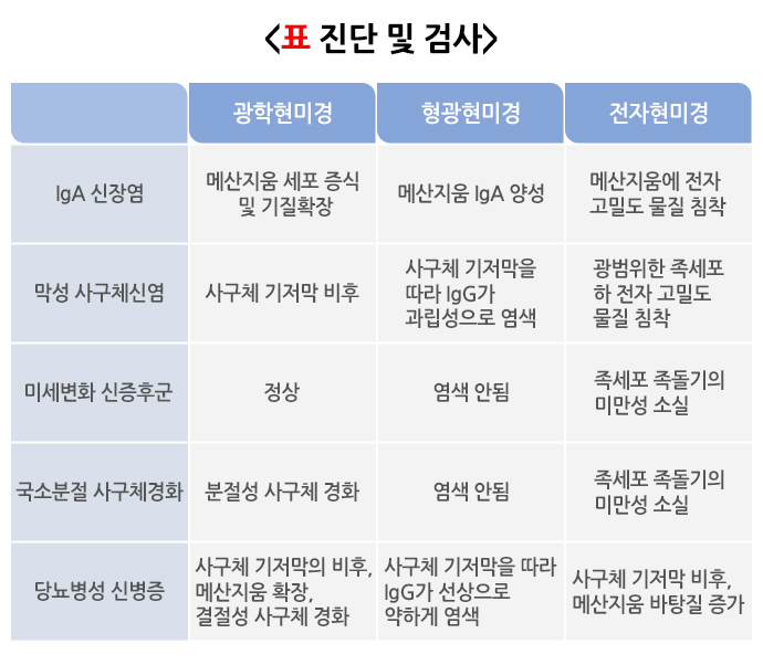 신장 조직 검사는 일반적인 조직 검사와 달리 광학 현미경, 형광 현미경, 전자 현미경 등 세 가지 현미경 소견을 모두 확인한 다음에 최종 진단을 내립니다. 광학 현미경으로는 사구체의 숫자, 크기, 구조적 이상, 세포 증식, 사구체 기저막의 변화, 세뇨관 간질 부위의 변화 등을 확인합니다. 형광 현미경으로는 면역 글로불린 및 보체의 사구체 침착 유무, 종류 및 패턴을 확인해 면역학적 기전에 의한 사구체 손상인지 판단합니다. 전자 현미경 검사를 통해서는 사구체 여과 장벽의 미세 구조 변화, 면역 복합체의 침착 여부 및 상세 부위, 사구체를 이루는 세포의 형태학적 변화 등을 확인합니다. 이 세 가지 현미경 검사상 특징적인 이상 소견을 종합해 각 질환을 진단하는데, 대표적인 예를 들면 아래와 같습니다.