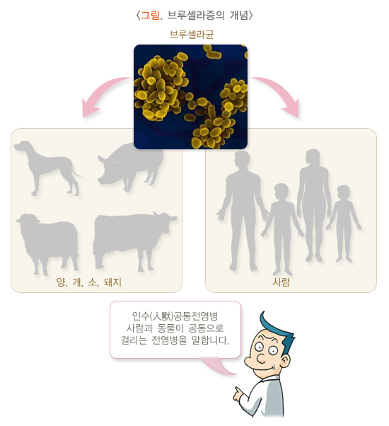 브루셀라증은 브루셀라 세균에 감염된 동물로부터 사람이 감염되어 발생하는 질환입니다. 브루셀라증은 1887년 브루스(Bruce) 박사가 원인균인 브루셀라 멜리텐시스(Brucella melitensis)를 분리하면서 이 질병이 밝혀졌습니다. 최근 국내에서 소 브루셀라병은 엄격한 살처분 정책을 유지하고 있으며, 사람에서의 브루셀라증은 연간 10명 미만으로 발생하고 있습니다.
