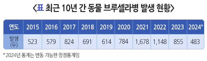 2) 동물 동물 브루셀라병은 2000년부터 통계에 반영되어 2006년 25,525두 발생을 정점으로 이후 효과적인 방역 정책의 시행으로 꾸준히 감소 추세에 있으며 연간 1,000건 내외로 발생하고 있습니다.