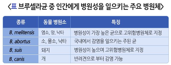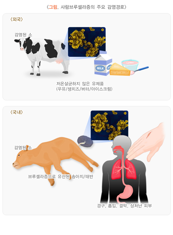 동물로부터 인간으로 전파되는 주요 브루셀라증의 병원체는 4가지 종류가 있으며 그 중 국내에서 감염을 일으키는 주된 브루셀라균은 B. abortus로 알려져 있습니다. 이 균은 끓이거나 저온 살균법에 의해 쉽게 죽지만, 냉동이나 건조에는 잘 견딥니다. 이러한 저온, 건조한 환경에서는 브루셀라균이 에어로졸의 형태로 변해 공기를 통해 쉽게 전염 됩니다.