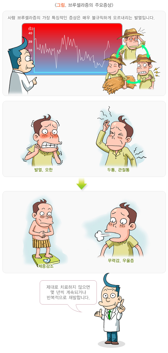 사람 브루셀라증의 임상 증상은 매우 다양한 것으로 알려져 있으며, 주된 임상 증상은 다음과 같습니다.
