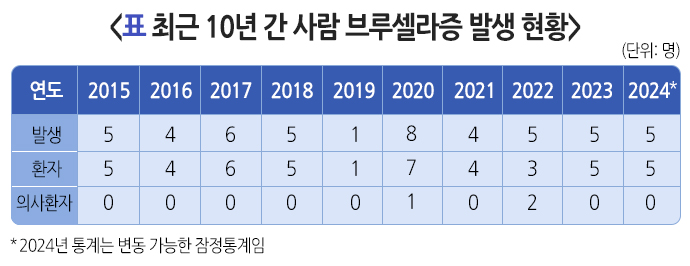 브루셀라증은 2000년 법정감염병으로 지정되었으며 현재는 연간 10건 이내로 발생하고 있습니다.