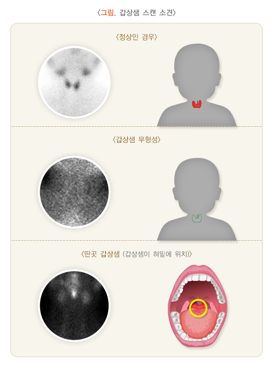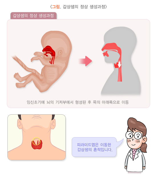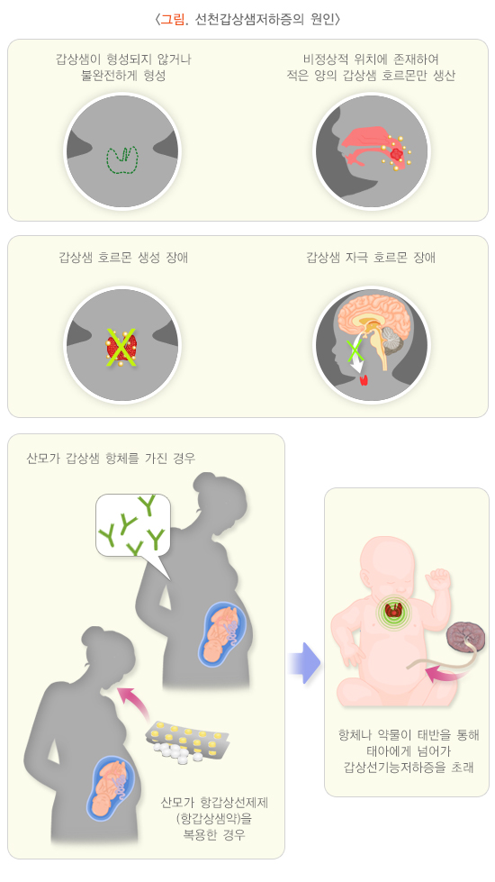 선천갑상샘저하증의 가장 흔한 원인(약 85%)은 갑상샘이 제대로 형성되지 않는 것입니다. 갑상샘은 임신 초기에 뇌의 기저부에서 형성되기 시작해 목 아래쪽으로 이동하여 발달합니다. 발생 과정 중 문제가 생기면 갑상샘이 아예 형성되지 않거나 불완전하게 형성됩니다. 이동 중 일부 조직이 혓바닥, 혀 밑 등 비정상적인 위치에 남아(딴곳 갑상샘) 아주 소량의 갑상샘 호르몬을 생성하기도 합니다.