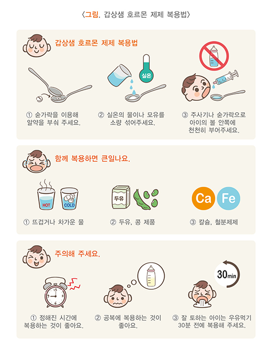 약을 토했을 경우에는 같은 용량을 다시 투여합니다. 정확한 용량을 먹이기 위해서 가능하면 매일 같은 시간대에 복용하는 것이 좋습니다. 기억하기 힘들다면 냉장고나 약을 보관하는 캐비넷 등에 달력을 놓고 약을 먹인 후 기록하면 도움이 됩니다. 갑상샘 호르몬을 적정 용량보다 많이 투약하면 잠을 잘 자지 않고 자주 보채며, 소변을 자주 보고 땀이 많이 나고 더워하며, 설사를 하고 체중이 감소할 수 있습니다. 심장 박동수가 빨라지기도 하고, 장기적으로는 두개골이 조기에 봉합되기도 합니다. 이런 증상을 보인다면 병원을 찾아 갑상샘 호르몬 수치를 검사해봐야 합니다. 또한, 갑상샘 호르몬제는 아이의 손에 닫지 않는 곳에 보관해야 합니다. 간혹 부모나 양육자가 미처 보지 못한 사이에 아기가 여러 알을 한꺼번에 복용하는 경우가도 있기 때문입니다.