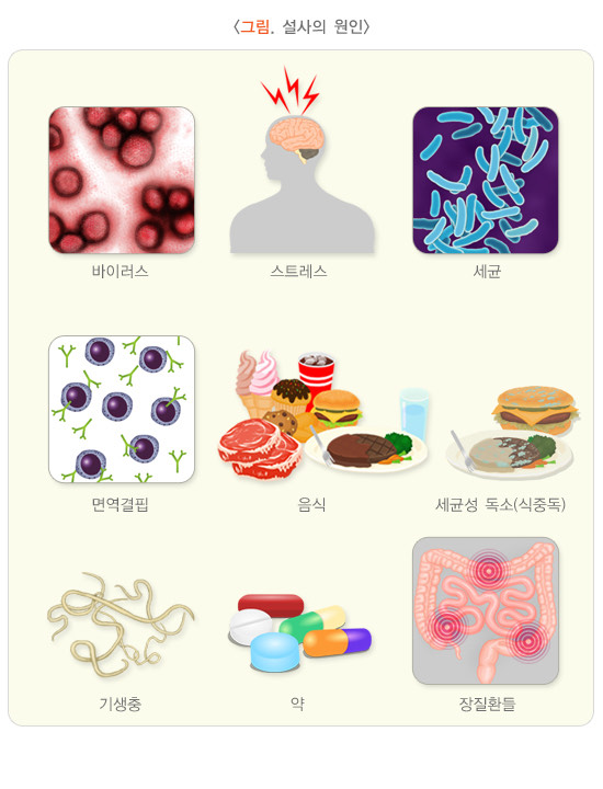 설사는 바이러스, 기생충, 음식, 약물, 의학적 상태와 치료에 의해서 언제든지 발생할 수 있습니다.