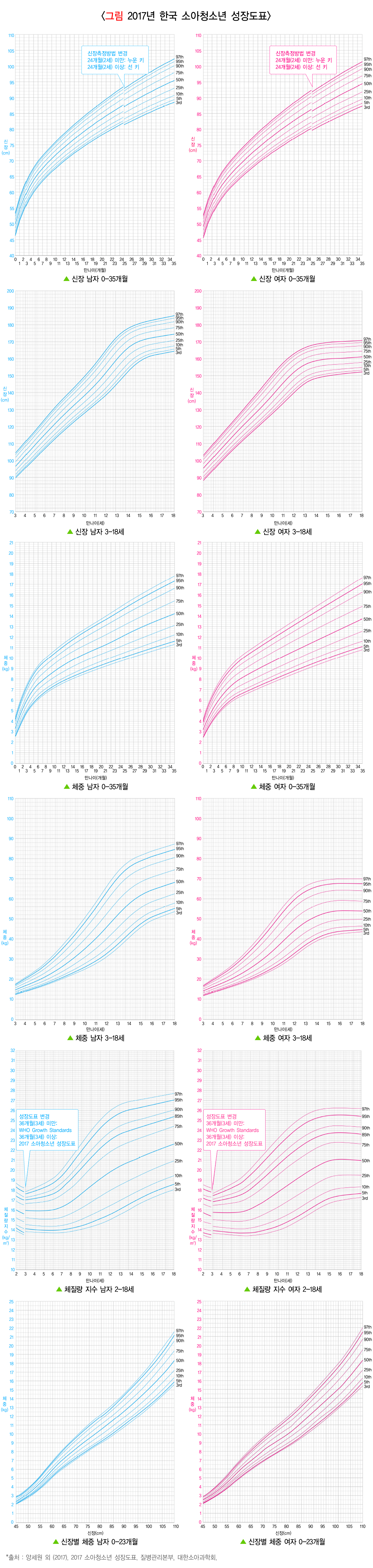 아기의 성장을 평가하는 데 있어서는 대한소아청소년과학회와 질병관리청에서 제공하는 성장도표 또는 5세 이하의 모유 수유아를 표준으로 채택한 세계보건기구(WHO) 표준 성장도표를 참고하는 것이 매우 유용합니다. 우리나라 성장도표에서는 체중은 5백분위수 이상 95백분위수 이하, 키는 3백분위수 이상 95백분위수 이하를 정상으로 간주하며, 짧은 기간 내의 급격한 변화 추이를 관찰하는 것도 중요합니다.
