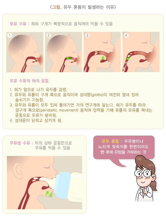 유두 혼동은 우유병이나 노리개 젖꼭지를 한 번이라도 빠는 바람에 아기가 유방을 거부하는 현상을 말합니다. 신생아는 다양한 방식으로 빨고 삼키는 능력을 배워야 하며, 처음 경험한 방법에 대해 기억이 강하게 남게 됩니다. 이 시기에 초유의 양이 적어 우유병이나 노리개 젖꼭지를 사용하면 혼동을 겪을 수 있습니다.