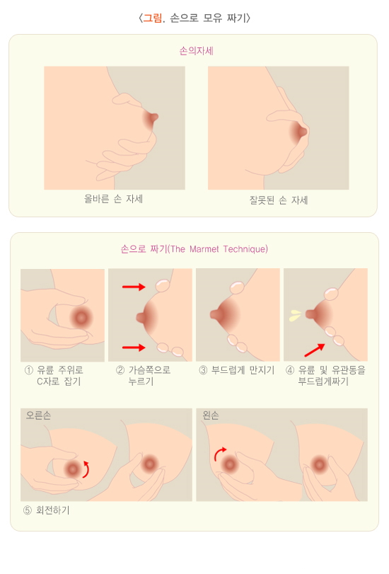 ② 손으로 짜기: 자연스러운 모유 사출 반사를 자극하고, 익숙해지면 손으로 짜는 방법은 매우 편리합니다. 엄지손가락을 유두 윗부분, 둘째와 셋째 손가락을 유두 아래 부분에 위치시키고 손가락을 유방 쪽으로 눌렀다 떼기를 반복하여 모유가 자연스럽게 흘러나오도록 합니다.