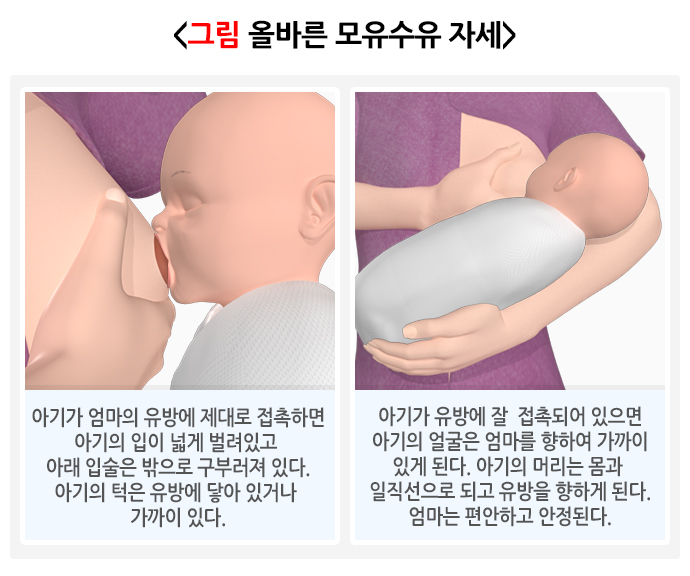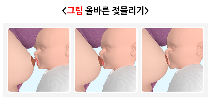 젖을 물릴 때는 아기의 아래 입술에 유방이 먼저 닿게 하여 아기의 입이 아래쪽 유륜을 충분히 문 후 위쪽까지 물게 유도합니다. 아기의 입이 120도 정도로 충분히 벌어진 상태에서 유두와 유륜을 깊게 물도록 합니다. 수유하는 동안 엄지는 아기의 코 쪽으로, 나머지 네 손가락은 유방 아래 반대쪽을 지탱하며, C자 또는 U자 잡기식이 좋습니다.