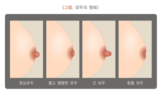 한쪽 유륜을 눌렀을 때 유두가 튀어나오지 않거나, 자극을 주거나 차게 했을 때 유두가 돌출되지 않는 경우를 말합니다. 유두 신장성 검사에서 유두가 쉽게 잡아당겨지는 경우 문제없이 젖을 먹일 수 있습니다.
