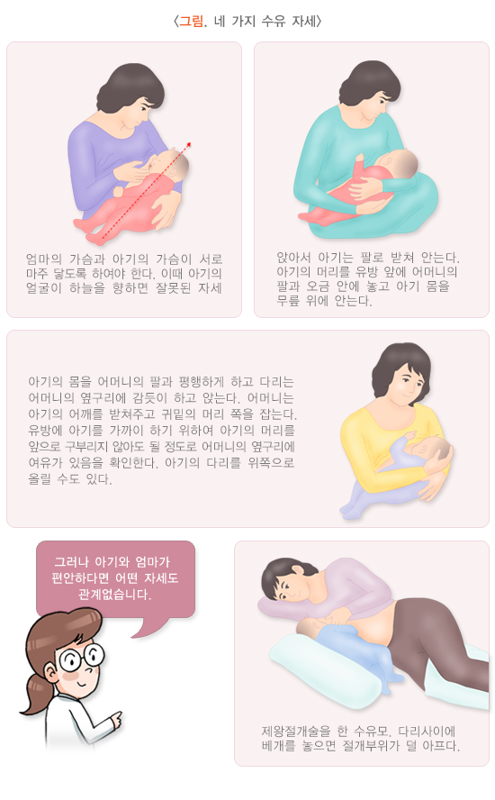 많은 모유 수유 자료에서는 네 가지 수유 자세가 기술되어 있습니다. 그러나 아기와 엄마 모두가 편안하다면 어떤 자세도 관계없습니다. 제왕절개로 출산한 경우에는 옆으로 안거나 누워서 수유하면 수술 부위의 통증을 줄일 수 있습니다.