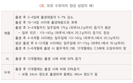 모유를 먹는 아기는 분유를 먹는 아기와 성장 패턴에서 차이를 보입니다. 모유 수유아는 생후 초기 6개월 동안 빠른 성장을 보이다가, 6개월 이후에는 체중과 키의 성장속도가 비교적 떨어질 수 있습니다. 하지만 이는 정상적인 성장 패턴으로, 2~5세가 되면 분유 수유아와의 성장 차이를 거의 없애고 비슷한 수준으로 따라잡습니다. 최근에는 분유 수유아의 초기 성장이 급격하고, 성장 이후에 비만이나 대사 이상을 일으킬 수 있다는 우려가 제기되고 있습니다. 정상적인 성장 범위에 있는 모유 수유아라면, 모유 수유를 계속 유지해도 건강에 문제가 없습니다. 모유 수유아의 정상 성장의 예는 다음 표와 같습니다.