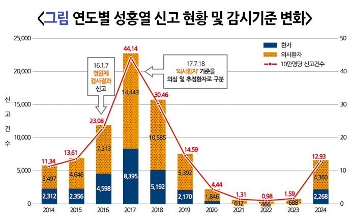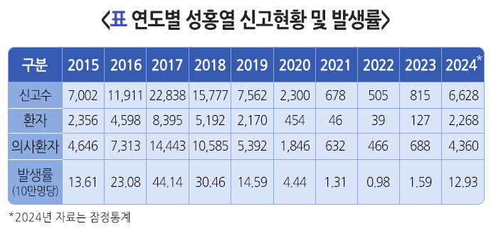 국내에서는 1954년 법정감염병으로 지정되어 1990년대 이후 연간 100명 내외로 신고 되었으나 2012년부터 성홍열의 신고범위가 기존 ‘환자’ 에서 ‘환자 및 의사환자’로 확대되고 2013년에 의사환자 정의가 변경됨에 따라 신고수가 크게 증가하였습니다.