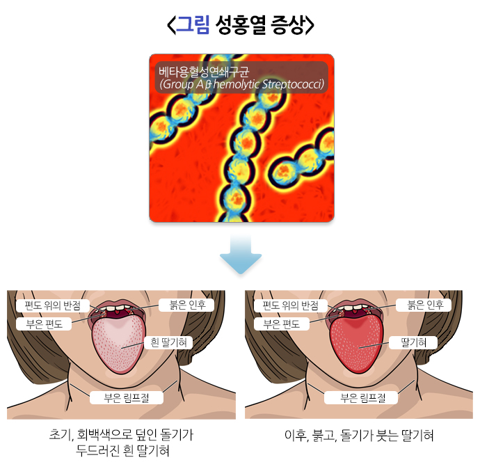 성홍열은 A군 베타 용혈성 연쇄구균(Group A β-hemolytic Streptococci)에 의한 급성 질환으로, 갑작스런 발열, 두통, 구토, 복통, 인후통 등으로 시작되어, 12~48시간 후에 전신에 전형적인 발진을 보이는 특징이 있습니다.