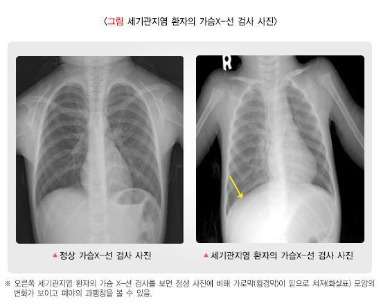 가슴 X-선 검사는 모든 환자에게 시행할 필요는 없습니다. 그러나 증상이 심해 입원해야 하거나, 특히 열이 있다면 폐렴이 동반됐는지 확인하기 위해 시행합니다. 좁아진 세기관지를 통해 공기가 잘 빠져나오지 못하므로 폐 전반에 걸친 과팽창 소견을 보입니다. 어린이는 이물 흡입으로 인해 기관지나 세기관지가 막혀 천명이 발생할 수 있습니다. 이를 세기관지염으로 오인할 수 있으므로 병력 청취와 진찰 소견으로 이물 흡입이 의심된다면 가슴 X-검사를 시행하여 확인합니다.