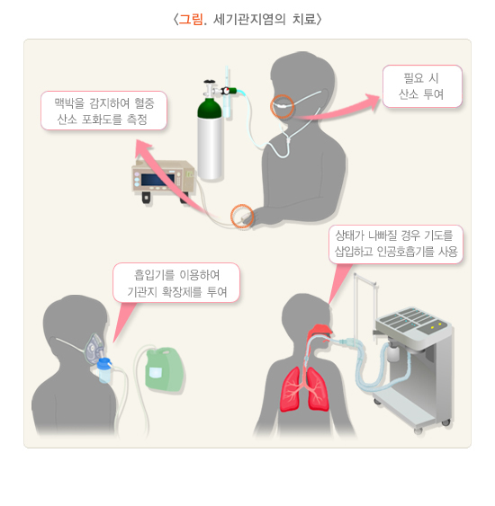 바이러스성 세기관지염은 일반 감기처럼 대증적으로 치료합니다. 그러나 호흡곤란이 있다면 입원해서 치료합니다.