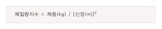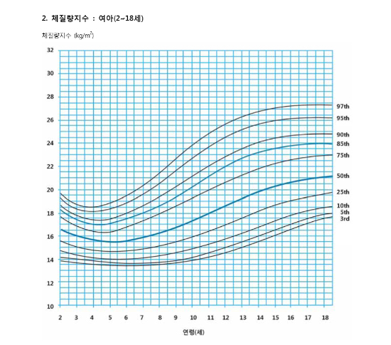 체질량지수는 체중을 키의 제곱으로 나눈 것으로, 85-94백분위수이면 비만 위험군, 95백분위수 이상이면 비만이라고 합니다. 6세 이상, 특히 청소년 비만의 진단에 유용하게 이용되며, 18세 이상에서는 25 kg/㎡ 이상이면 비만으로 진단합니다. 체질량지수는 체지방량, 체지방률과 상관관계가 높으며, 비만의 합병증인 고혈압, 이상지질혈증, 비만으로 인한 사망률과도 의미 있는 상관관계가 있는 것으로 알려져 있습니다.