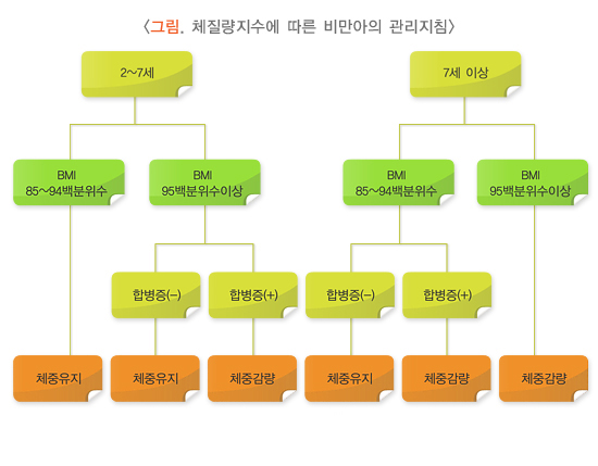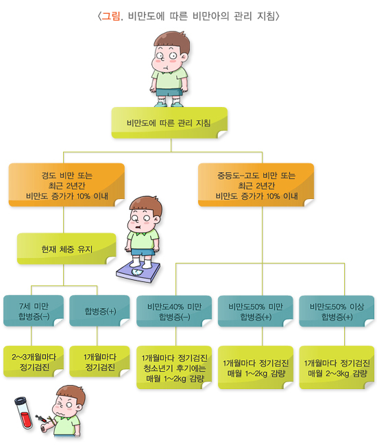 체질량지수가 85-94백분위수이면서 합병증이 동반한 7세 이상의 과체중아는 체중 감량을 필요로 합니다.