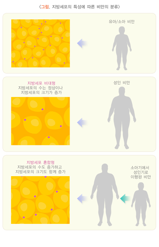 비만은 지방 세포의 특성에 따라 세 가지로 나눌 수 있습니다. 즉, 지방세포의 크기는 정상이나 지방세포의 수가 증가하는 지방세포 증식형, 지방세포의 수는 정상이나 지방세포의 크기가 증가하는 지방세포 비대형, 지방세포의 수도 증가하고 지방세포의 크기도 함께 증가하는 지방세포 혼합형으로 나눌 수 있습니다.