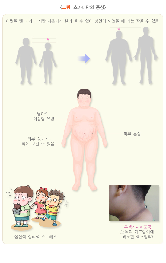 프레더-윌리(Prader Willi) 증후군, 바르데-비들(Bardet-Biedl) 증후군, 터너(Tuner) 증후군, 알스트롬(Alstrom) 증후군 등