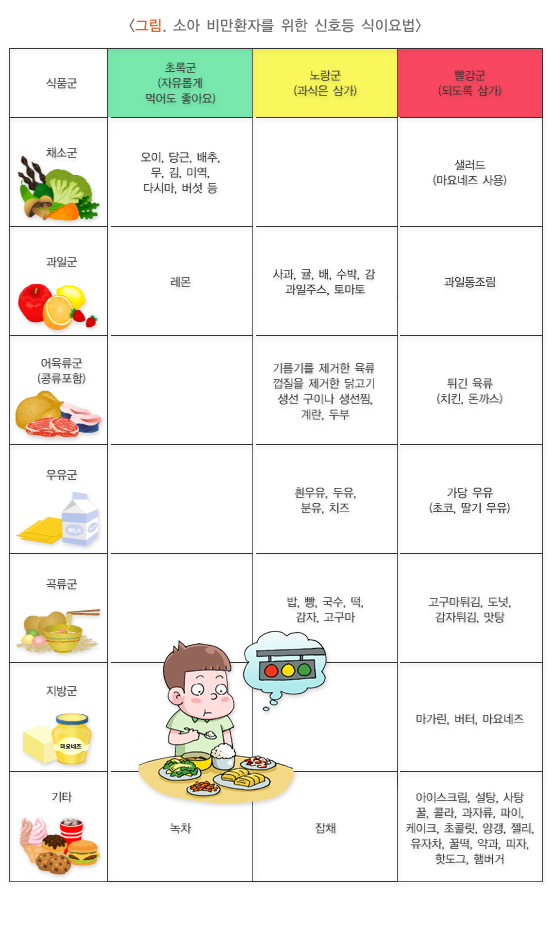 신호등 식이요법은 소아에게 유용하게 사용할 수 있는 방법입니다. 이는 신호등의 색깔에 따라 초록군, 노랑군, 빨강군으로 나눕니다. 초록군은 섬유소가 풍부하고 열량이 낮은 식품으로 대부분의 채소들이 여기에 속하며, 제한 없이 먹어도 됩니다. 노랑군은 단백질을 포함하여 중간 정도의 열량의 식품들이 해당되며, 정해진 양만 먹고 과잉섭취를 하지 않도록 주의해야 합니다. 빨강군은 열량이 매우 높은 기름진 음식이나 당분이 함유된 음식들이 해당되며, 되도록 먹지 않도록 하여야 합니다.