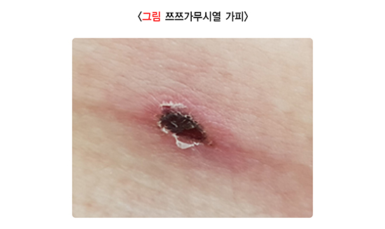 털진드기 유충에 물린 후 10~12일 뒤에 감기와 유사한 증상을 보이지만, 고열이 지속됩니다. 증상이 발생하고 3~7일에 홍반성 구진발진이 몸통에서 시작하여 팔다리로 퍼집니다. 진드기가 물린 자리에 붉은 테두리를 동반한 통증이 없는 가피가 형성됩니다. 소아에서 쯔쯔가무시열 발생 시 폐렴 및 뇌수막염 등 심각한 합병증이 발생할 수 있어 항생제 치료가 필요합니다.