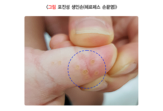 단순 포진 바이러스 감염은 흔히 ‘헤르페스’로 알려져 있습니다. 영아 및 소아에서 가장 흔한 형태는 헤르페스 치은구내염으로, 혀, 뺨, 입안 점막에 수포가 발생하여 터진 후 궤양으로 변합니다. 고열, 심한 입안 통증, 침 흘림 등을 동반합니다. 입술 헤르페스에서는 수포가 입술과 피부 사이 경계에 가장 흔하게 생깁니다. 피부 외상이나 상처에 바이러스가 감염되어 생길 수 있는데, 손가락이나 발가락에 생기면 포진성 생인손이라고 합니다. 경우에 따라 항바이러스제를 투여할 수 있습니다.