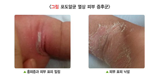 피부 발진은 목, 겨드랑이, 사타구니에 선홍색의 작은 구진발진으로 시작되어 24시간 이내에 몸통 전체로 퍼집니다. 보통 3~4일 후 발진이 사라지면 얼굴부터 꺼풀이 벗겨지고 몸통, 손, 발로 진행합니다. 종종 가벼운 일광 화상과 비슷한 모양입니다.