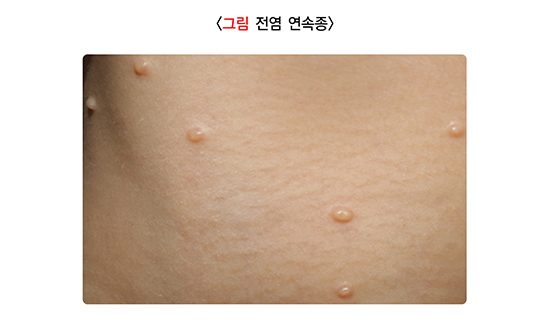 폭스바이러스 감염에 의해 발생합니다. 구진성 피부 병변으로 중심부의 함몰이 특징적이며, 병변을 긁어내면 흰색의 비지 같은 물질이 나옵니다. 여러 개가 신체 어느 부위에나 발생할 수 있으며, 본인의 몸에서 바이러스를 다시 퍼트리는 ‘자가접종’에 의해 새로운 병변이 발생하여 수년간 지속될 수 있습니다. 치료는 병변을 긁어내는 소파술이 가장 효과적입니다.