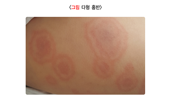 다형 홍반은 바이러스나 세균 감염, 약물에 대한 과민반응으로 발생하는 발진입니다. 피부에 표적모양 병변이 특징입니다. 표적모양 병변은 중심부에 홍반, 부종성 원, 가장 바깥쪽에 홍반성 테두리 등 세 개의 층으로 나타납니다. 단순 포진 바이러스 감염에서 흔한 것으로 알려져 있으며, 소아에서는 폐렴마이코플라즈마 감염에서 흔히 발생합니다. 대부분 1~4주 이내에 자연적으로 소실되지만 재발할 수 있습니다.