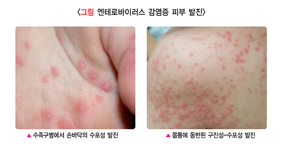 엔테로바이러스(장바이러스) 감염은 소아에서 매우 흔하며 다양한 질환을 일으킵니다. 피부 발진과 관련된 대표적인 엔테로바이러스 감염질환이 수족구병입니다. 입에는 혀, 입천장, 잇몸 및 입술 등에 작은 크기의 궤양이 발생합니다. 피부 발진은 손과 발에 수포성으로 나타나며, 손바닥과 발바닥보다 손등과 발등에 더 많습니다. 몸통이나 엉덩이에도 발진이 나타날 수 있습니다. 특별한 항바이러스제 치료는 없습니다.