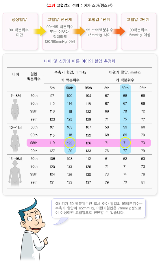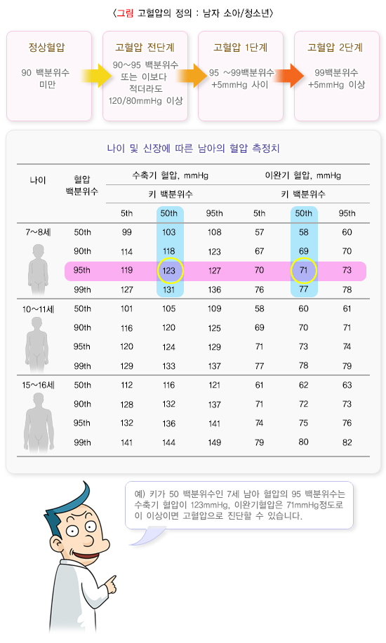 정상혈압은 동일한 성별과 연령을 가진 소아 혈압의 90 백분위수 미만인 경우를 말합니다(여기서, 백분위수라 함은 측정치를 순서대로 나열한 값으로, 가장 작은 값을 1 백분위수, 가장 큰 값을 100 백분위수라고 정의하며, 비슷한 키를 가진 소아의 혈압과 비교해야 합니다).
