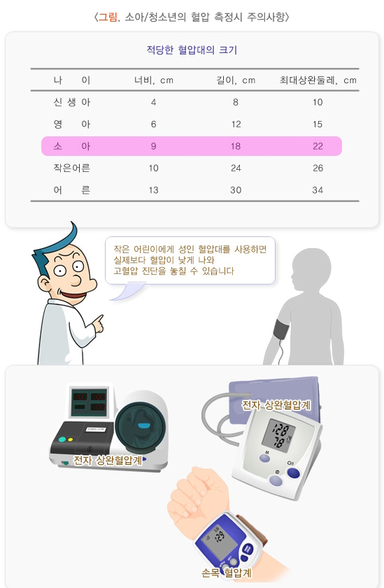 소아의 혈압을 측정할 때는 혈압대의 너비가 적당한 것을 사용하는 것이 중요합니다. 혈압대 너비는 어린이 상완 중간 둘레의 약 40%정도 되는 것이 적당합니다. 좁은 혈압대를 쓰면 혈압이 실제보다 높게 나오고, 넓은 것을 쓰면 실제보다 낮게 나올 수가 있어 주의가 요구됩니다.