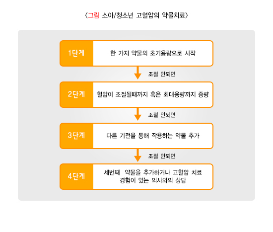 소아 고혈압은 각 단계별로 다음과 같이 치료할 수 있습니다.