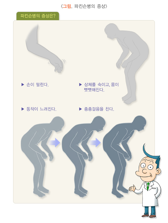 일반적으로 잠을 잘 때는 없어지며 흥분할 때 심해지지만, 병이 오래된 경우에는 떨림이 지속되기도 합니다. 파킨슨병은 본태 떨림과 다르게 움직임이 느려지고, 발을 땅에 끌면서 걷고, 자세가 불안정해지고, 얼굴에 표정이 없어지고, 글씨를 작게 쓰게 되고, 근육이 긴장해 발작하는 등 신경학적 이상 증상을 동반합니다.