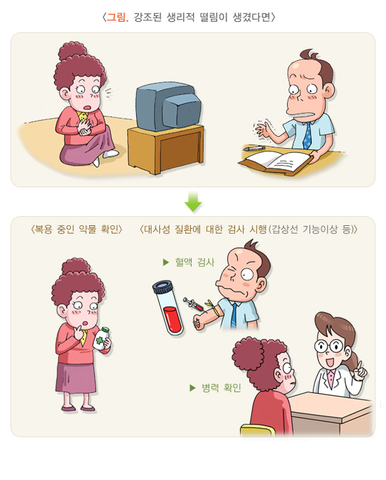 우선 병의원에 내원하여 신체적 검진을 통해 떨림의 종류를 파악하는 것이 가장 기초가 됩니다.