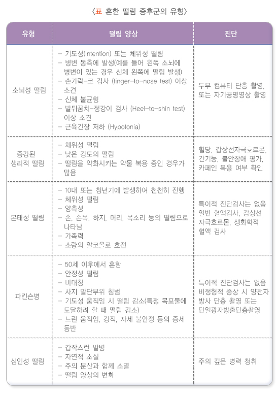 수전증, 본태떨림, 활동떨림, 체위떨림, 파킨슨 병