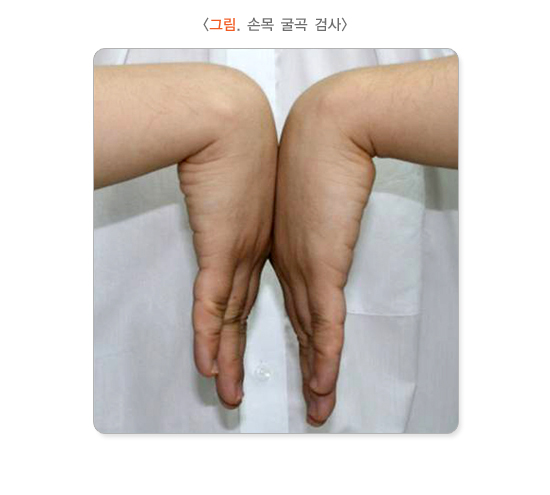 손등을 마주한 자세로 손목을 굽혀 유지할 때 1분 안에 손이 저려 오면 수근굴 증후군을 의심합니다.
