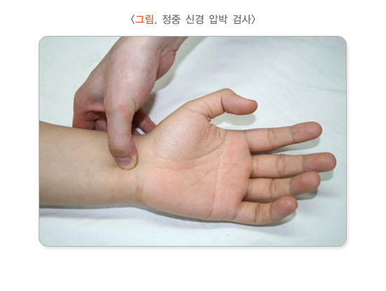 정중 신경이 지나는 손바닥 쪽 손목의 전방 부위를 손가락으로 깊게 누를 때, 정중 신경 분포 영역에 이상 감각이나 통증이 나타나면 수근굴 증후군을 의심합니다.