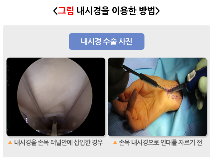최근에는 내시경 수술이 소개되어, 시행 빈도가 늘고 있습니다. 내시경 수술은 기존의 관혈적 수술보다 절개 부위가 작고, 피부나 다른 조직 손상이 적어 수술 후 통증을 줄이고 빠른 회복이 가능합니다. 하지만, 불완전한 수술로 증상이 지속되거나 일시적인 신경손상 가능성이 존재합니다.