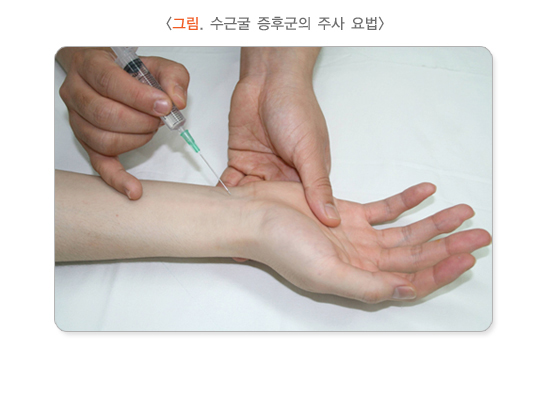 비수술적 치료인 손목 주사 요법을 시행하는 모습입니다. 그러나 이 방법은 수 주 간격(4~6주)으로 2~3회만 시도할 수 있습니다. 또한 수근굴 내 결절종 등의 종양이나 감염처럼 확실한 병리가 없는 경우에 한해 시행해야 합니다. 통증은 심하나 신경 근전도 검사 결과가 나쁘지 않은 경우, 임신 중 발생한 것과 같이 일시적인 경우에 효과가 있습니다. 증세의 완화는 일시적이며 재발하는 경우가 많다는 데 유의해야 합니다.