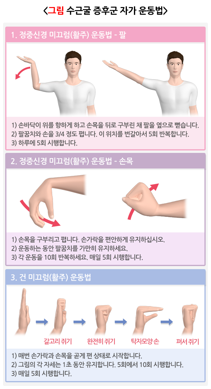 수근굴(수근관) 증후군이란 엄지손가락과 둘째, 셋째, 그리고 넷째 손가락의 엄지 쪽 절반의 감각 및 엄지손가락 운동 기능의 일부를 담당하는 정중 신경이 손목 부위에서 압박되어, 손과 손가락의 저림, 통증, 감각 저하, 부종, 힘의 약화 등이 나타나는 말초 신경 압박 증후군입니다.